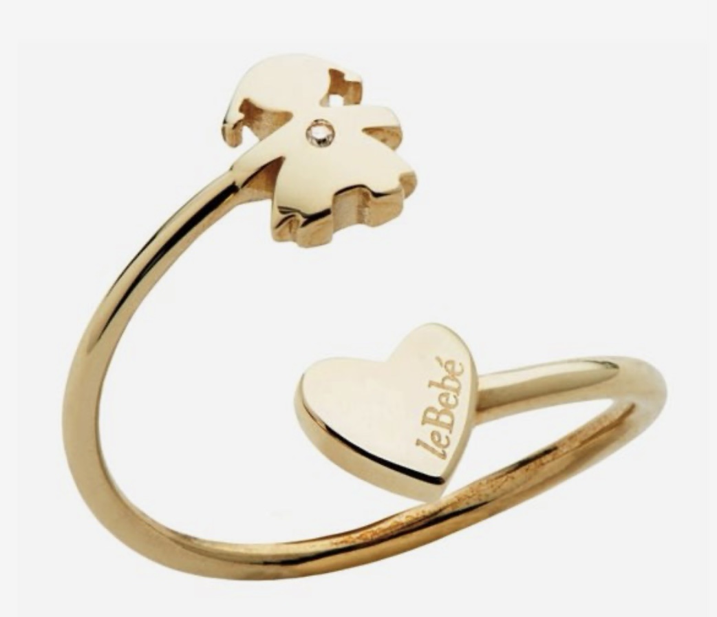 L’anello Le Bebè LBB703 (taglia 13) è in oro giallo 9 kt con sagoma stilizzata di bimbo/cuore e piccolo diamante, simbolo di affetto e legame familiare, adatto a regalo per nascita o maternità, venduto con scatola e certificato del marchio.