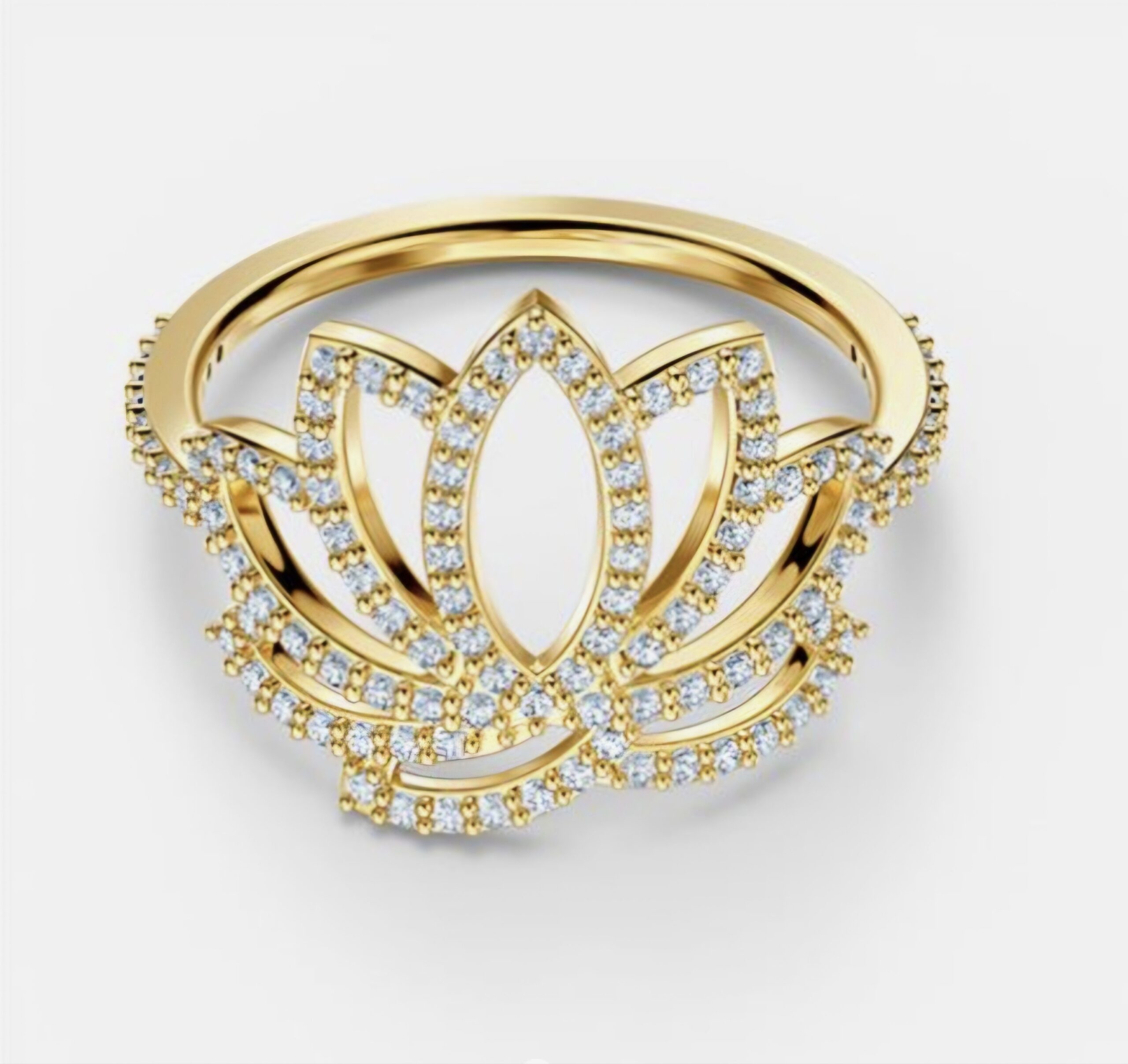 Questo splendido anello Swarovski ha la forma di un bocciolo di loto stilizzato, impreziosito da numerose pietre bianche su una base placcata nella tonalità oro.