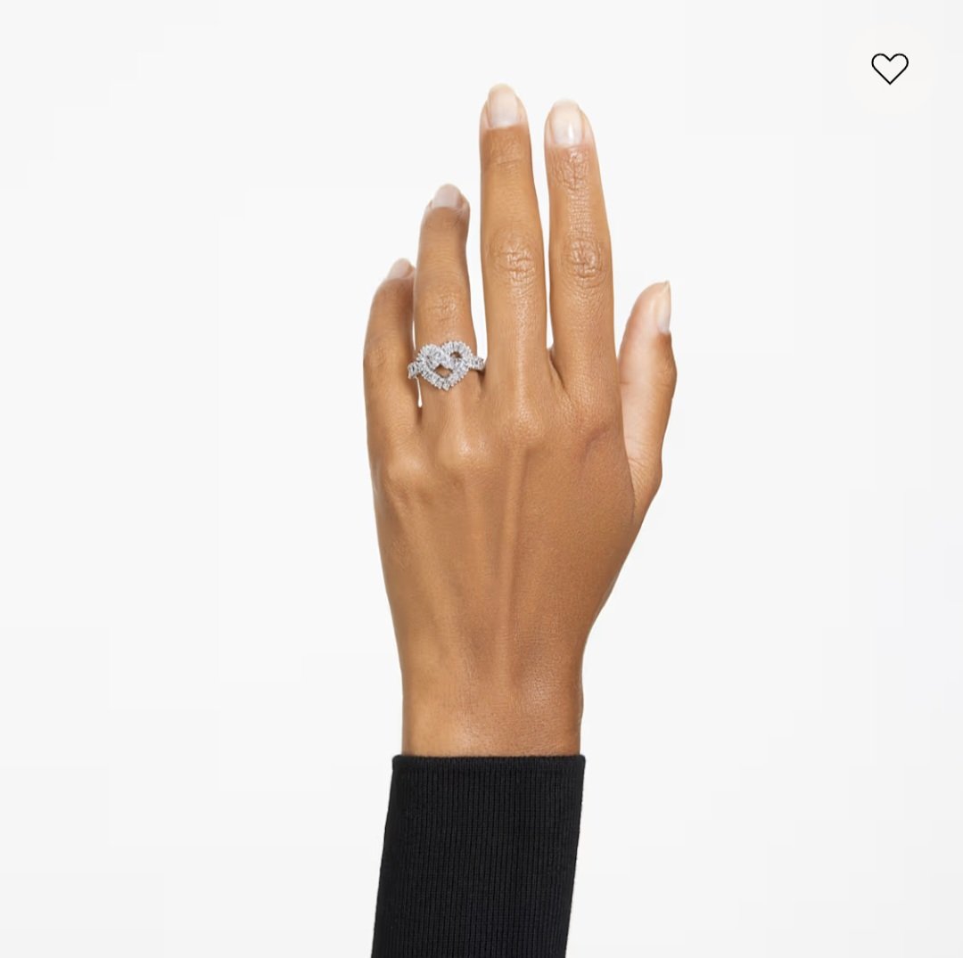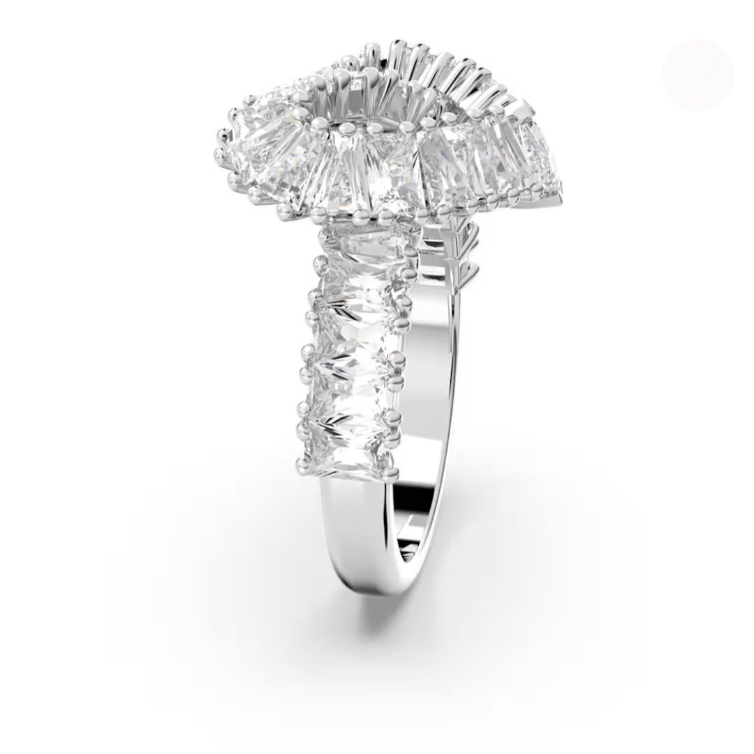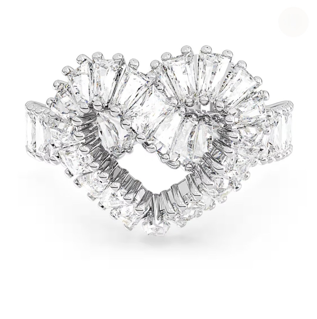 Intrecciato in un eccezionale design a forma di cuore, questo anello Matrix risplende di eleganza. La maestria artigianale è alla base del design placcato rodio impreziosito da una serie di cristalli Cry in vari tagli, tra cui i tagli Baguette, Tapered baguette e Kite.