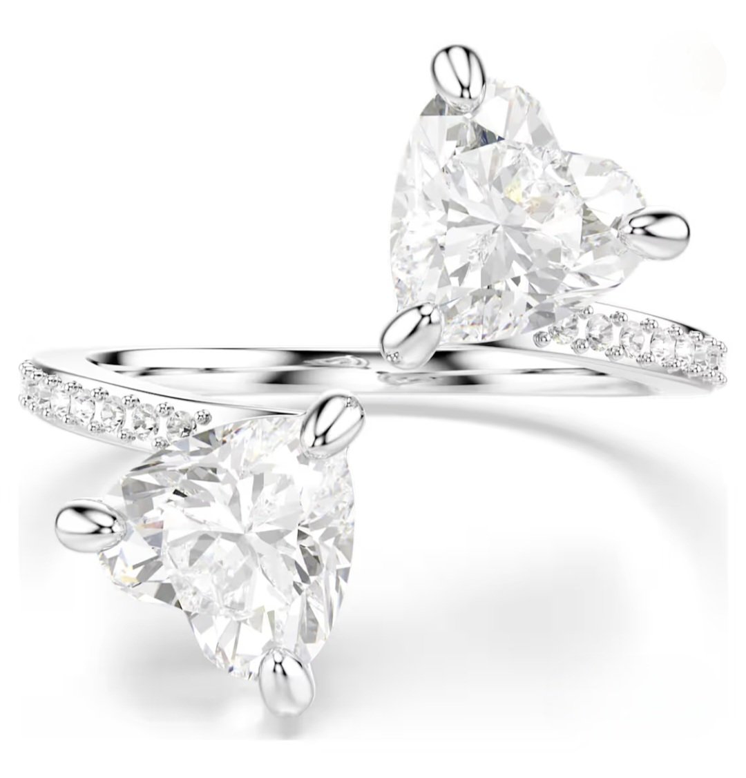 Questo anello Swarovski con finitura in tonalità argento è ispirato all’idea di due cuori che si incontrano. Cattura lo spirito del romanticismo con due pietre a forma di cuore dal taglio elegante che si incontrano al centro. Il bianco luccicante dei cuori è impreziosito ancora di più da un design semplice ed elegante.