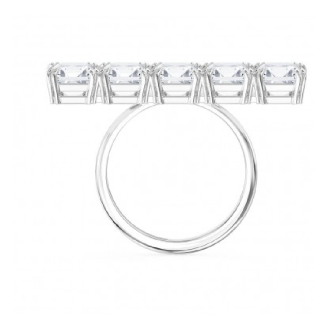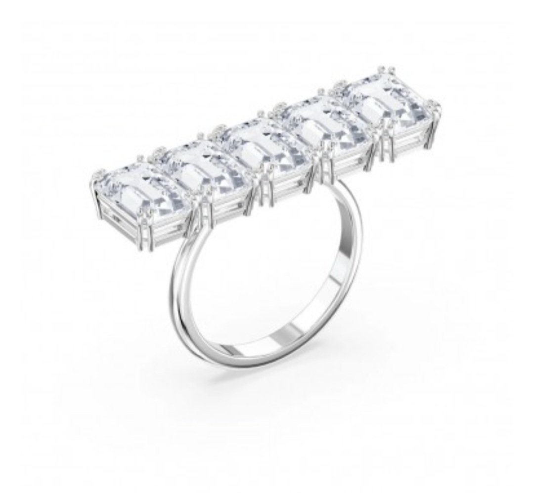 Gioiello Swarovski collezione Millenia, con le sue linee pulite e l’equilibrio perfetto, questo anello d’ispirazione geometrica è il trionfo del minimalismo moderno. Sfoggiando cristalli trasparenti taglio octagon in una serie di montature ad artiglio placcate in rodio, può essere indossato con tutto e niente, di giorno e di sera. Questo anello fa parte della serie Millenia ed è firmato dal Direttore creativo Giovanna Engelbert per la Collezione I.