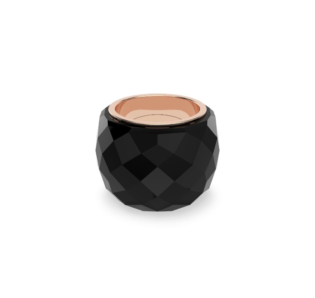 L’intenso cristallo nero è stato magistralmente realizzato con numerose e scintillanti sfaccettature, perfettamente ideato per ricreare un discreto motivo a forma di cuore. L’anello interno è placcato in PVD nella tonalità oro rosa per aggiungere imponenza a questo elegante ed accattivante accessorio.