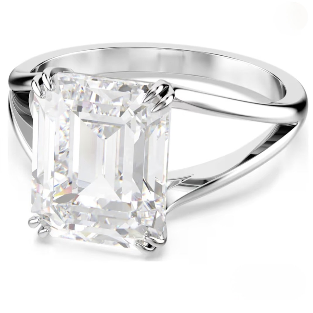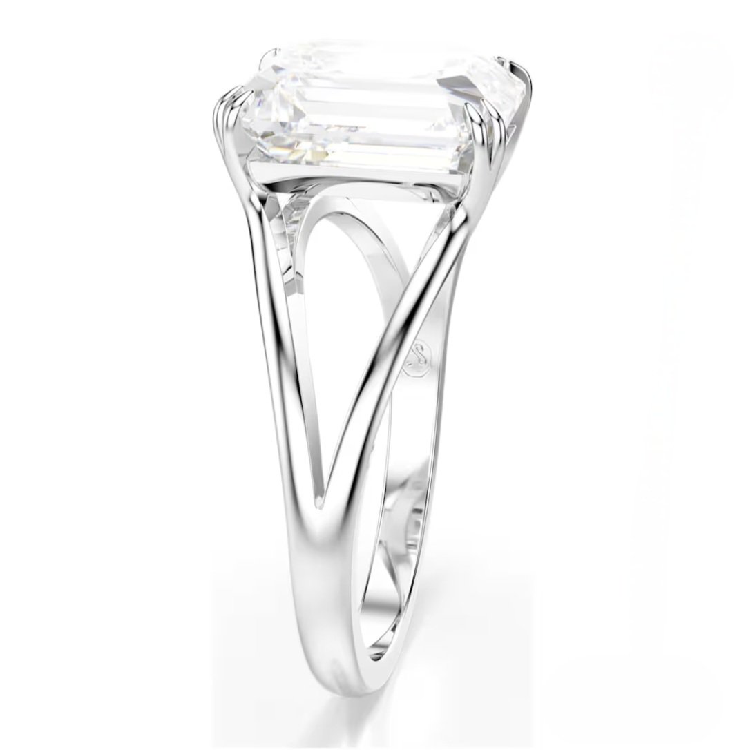 Questo radioso anello cocktail conferirà una nota di glamour in più al tuo styling. Il design placcato rodio presenta una fascia scissa con una Swarovski Zirconia dal taglio Octagon al centro, fissata con una raffinata montatura a griffe doppia.