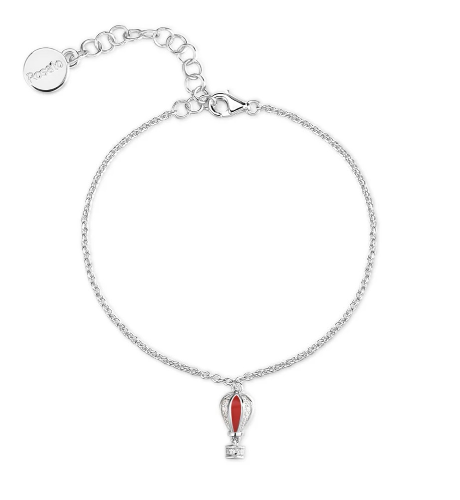 Bracciale morbido in argento 925‰ con pendente a forma di mongolfiera, smalti colorati, 28 cubic zirconia bianchi