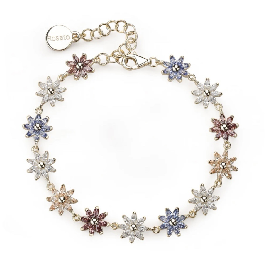 Bracciale morbido con fiori in argento 925‰, placcatura oro giallo, 104 cubic zirconia bianchi, rodolite, blu e champagne