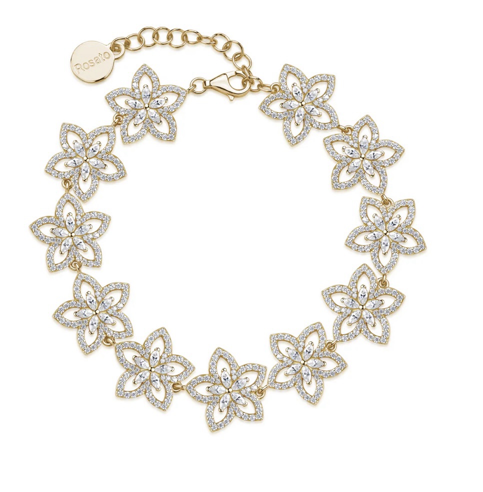 Bracciale morbido in argento 925‰, placcatura oro giallo, 605 cubic zirconia bianchi con fiori