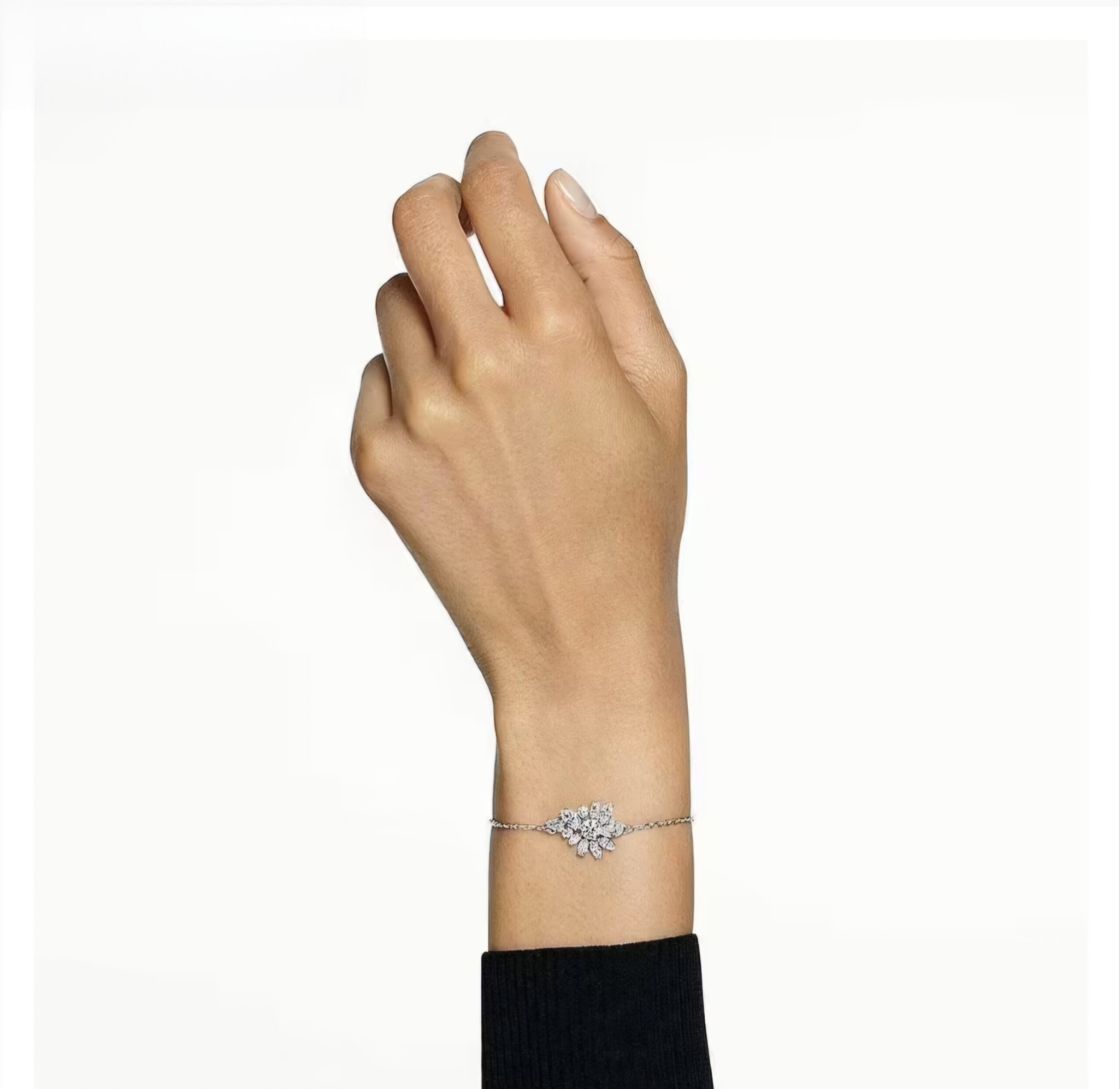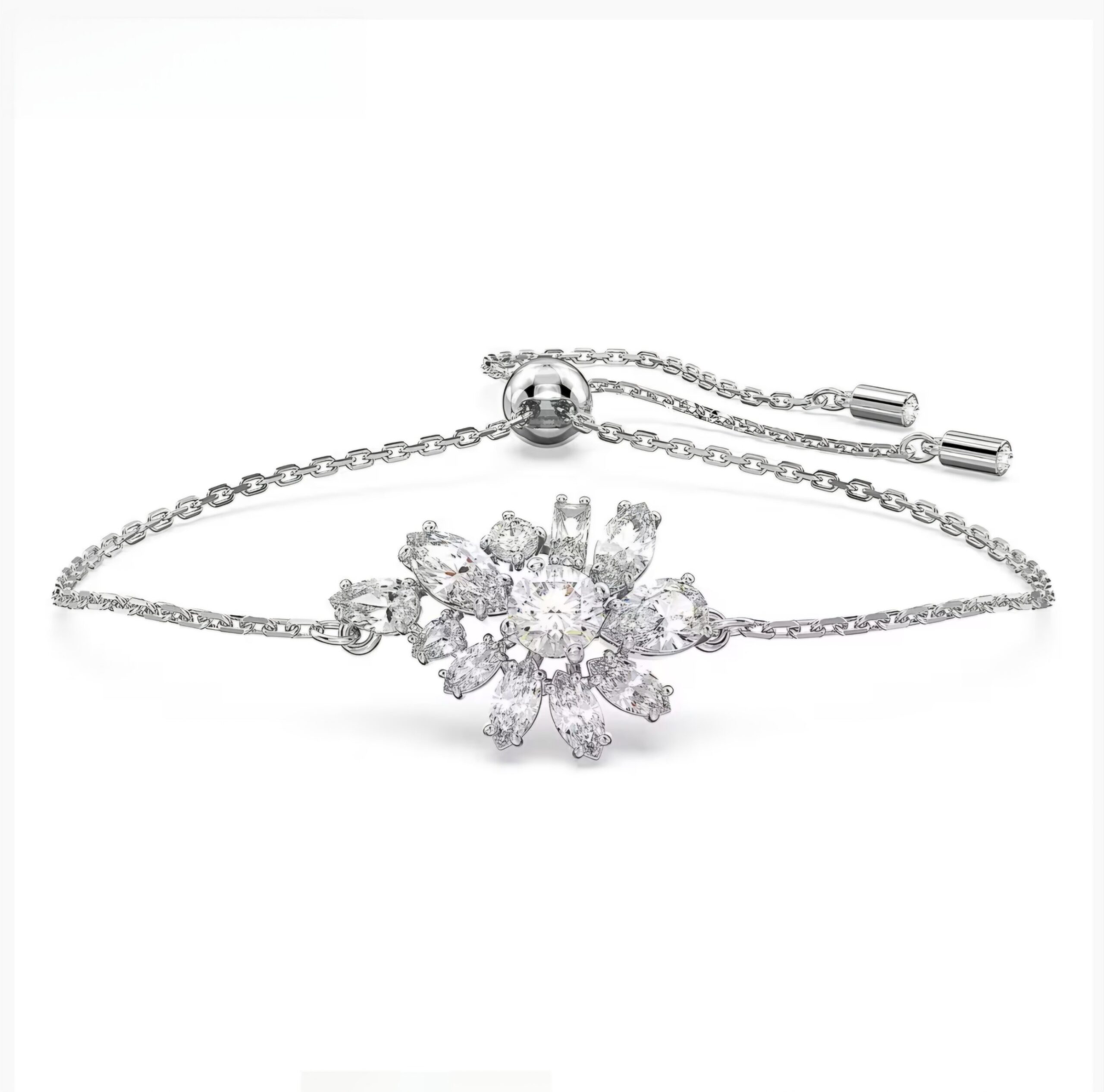 Bracciale da donna di Swarovski della collezione Gema. Bracciale di colore argento con fiore con cristalli di colore bianco. Taglia: M. Lunghezza massima: 24 cm.
