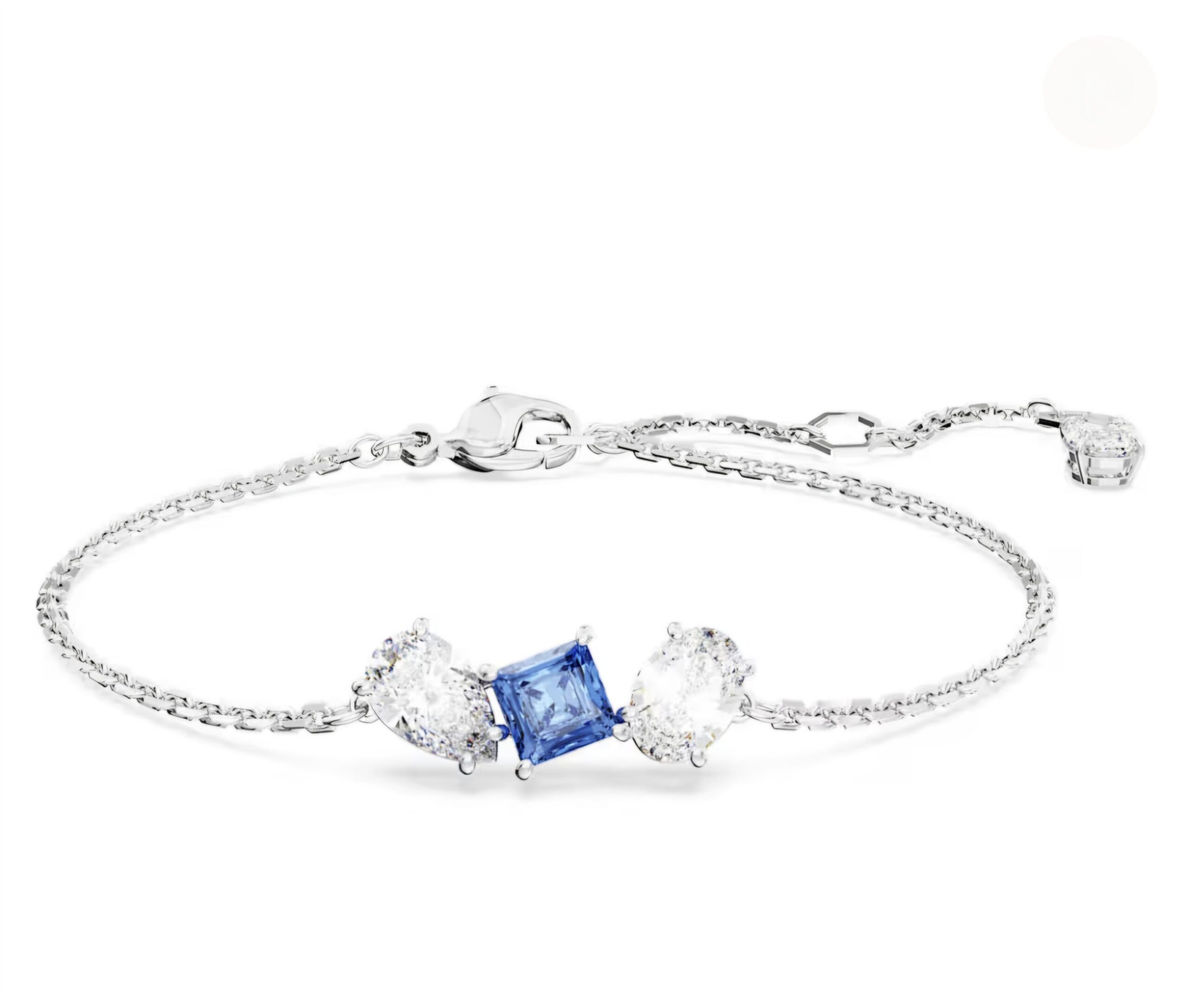 Impreziosito da una vera e propria esplosione di vivaci colori, questo bracciale Mesmera è qui per stupire. Il design placcato rodio è montato su una delicata catena da cui pende un allungamento e presenta un trio di Swarovski Zirconia di diverse forme con incastonatura a griffe, che comprendono anche una pietra quadrata centrale blu brillante.