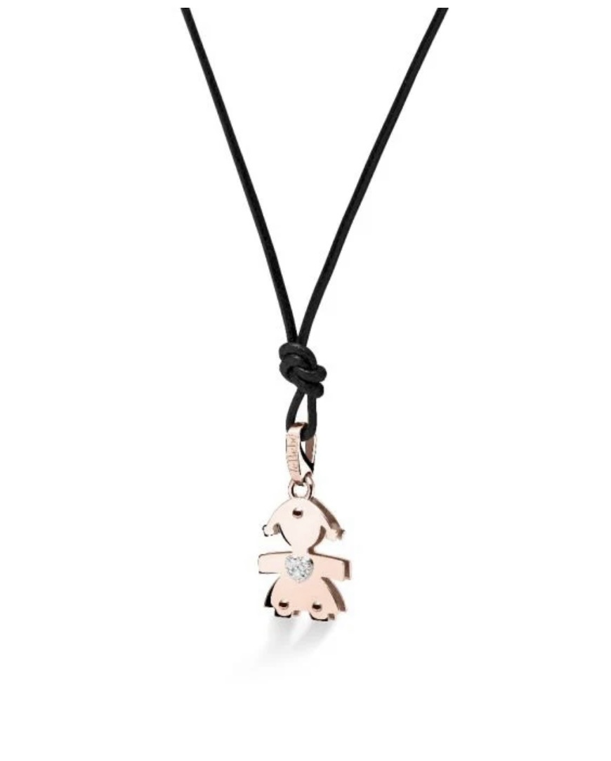 Le Bebè LBB067 è un ciondolo a forma di bimba in oro rosa 9 kt con diamanti (~0,03 ct), dalle dimensioni di circa 1,4 × 1,2 cm, pensato come simbolo di affetto e legame familiare, ideale come regalo per nascita, battesimo o maternità, venduto con scatola e certificato del marchio.