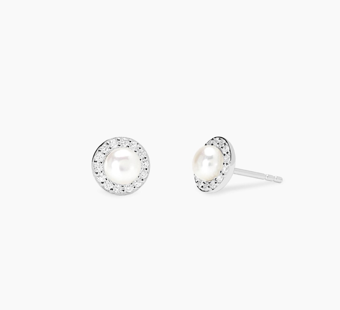 Orecchini a lobo in argento rodiato con perla coltivata e diamanti lab-grown 0,011 ct ciascuno.