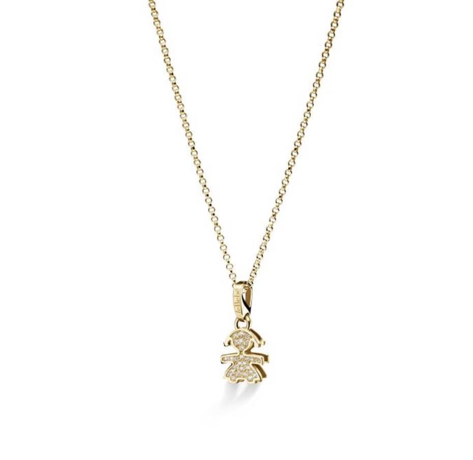Le Bebè LBB254 è una collana in oro giallo 18 kt con ciondolo a forma di bimba e diamanti pavé (~0,11 ct). Il ciondolo misura circa 1 × 0,9 cm, la catena è lunga 45 cm, ed è simbolo di nascita, maternità o legame madre-figlia, venduta con scatola e certificato del marchio.