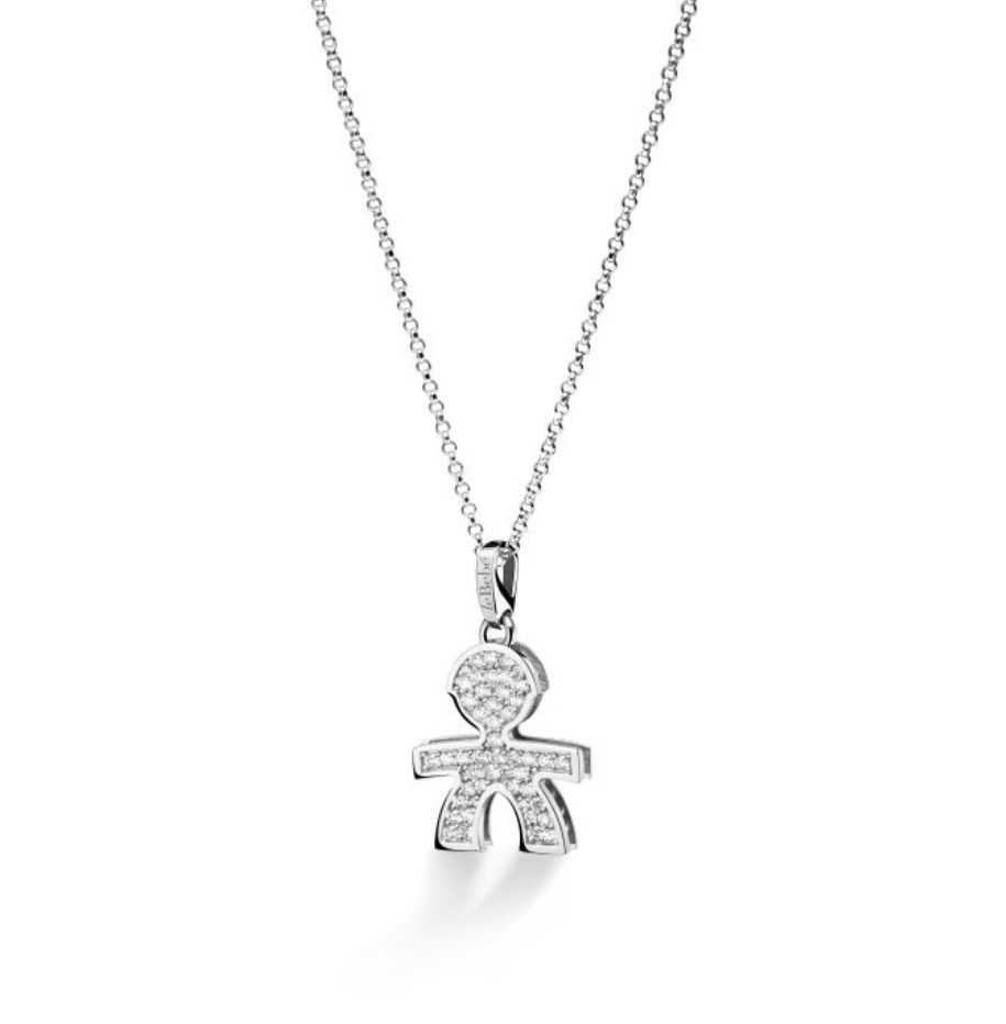 Le Bebè LBB425: collana con ciondolo a forma di bimbo della collezione I Preziosi, realizzata in oro bianco 18 kt con pavé di diamanti (circa 0,44 ct) e catena coordinata. È un gioiello simbolico dedicato alla maternità o alla nascita di un figlio