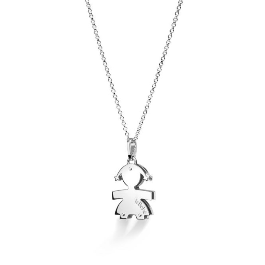 Le Bebè LBB426 è una collana con ciondolo a forma di bimba della collezione I Preziosi. Il gioiello è realizzato in oro bianco 18 kt con pavé di diamanti (circa 0,44 ct) e catena coordinata in oro. È un gioiello simbolico dedicato alla maternità o alla nascita di una figlia
