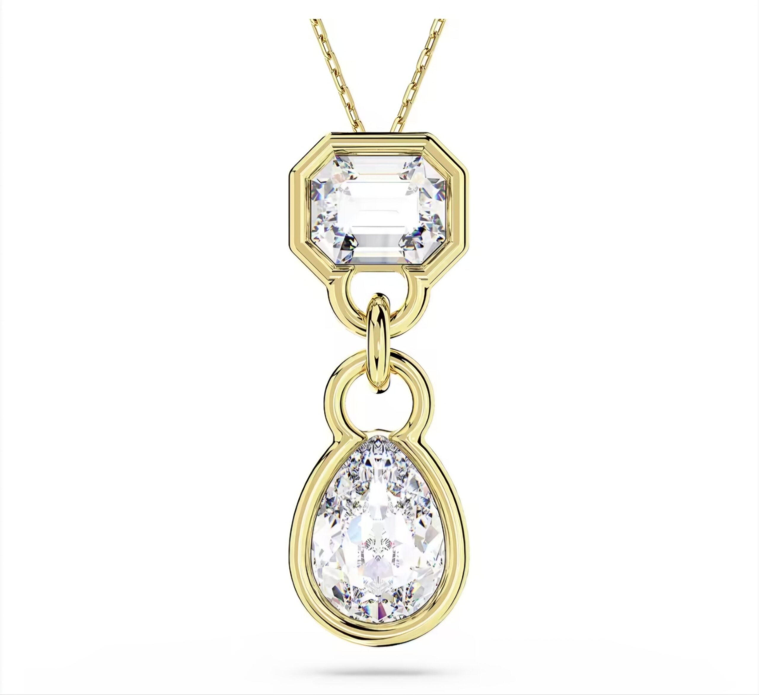 Pendente di Swarovski, con finitura in in tono dorato Zirconia, di colore bianco. Lunghezza (minima – massima): 40 – 49. 8 cm.