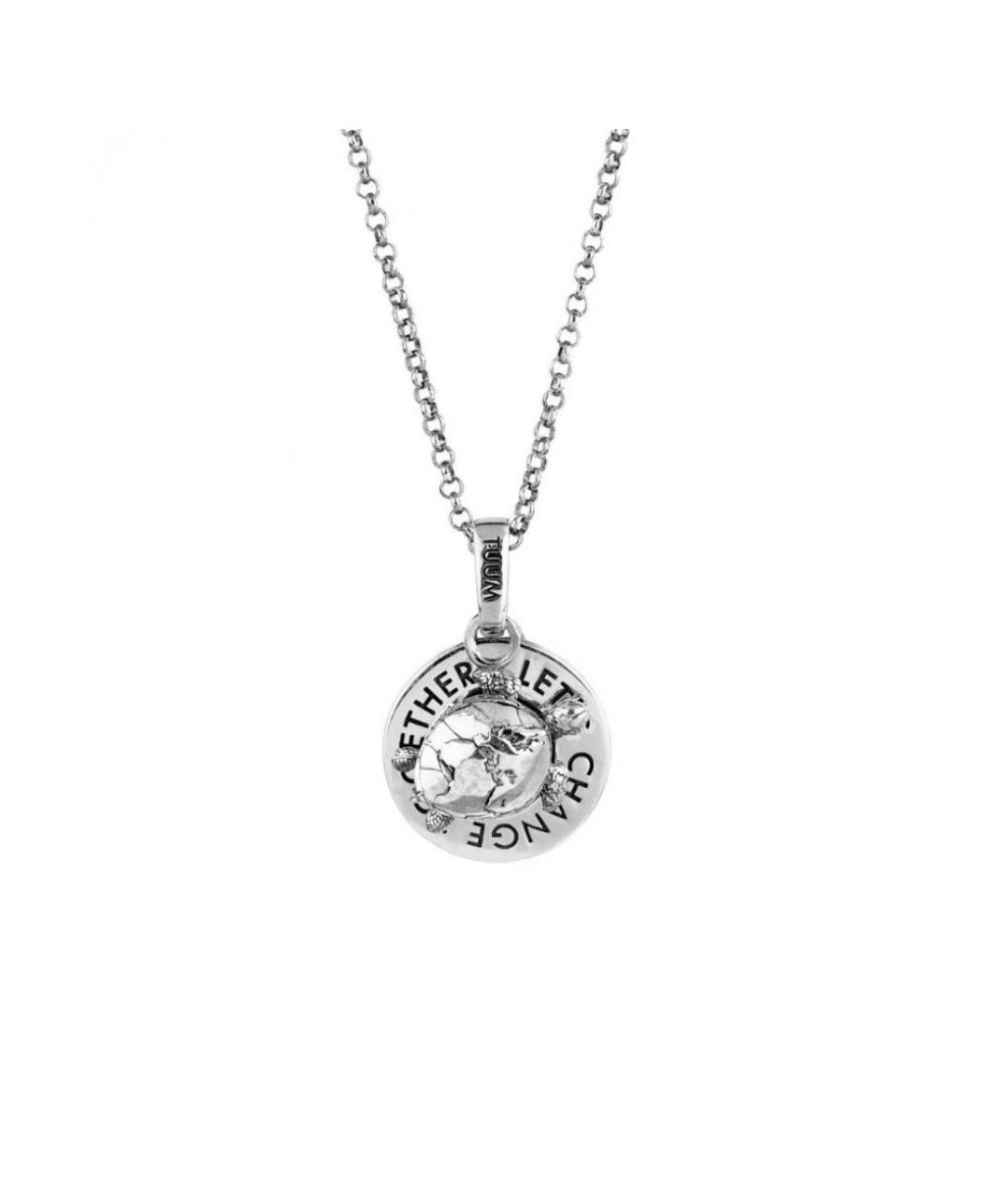 Collana maglia rolò realizzata in argento 925 brunito con una tartaruga marina ed una medaglia pendente in argento 925 brunito con incisione della scritta “Let’s change together” mentre sul retro è inciso il nome Gaia lucido su fondo sabbiato.