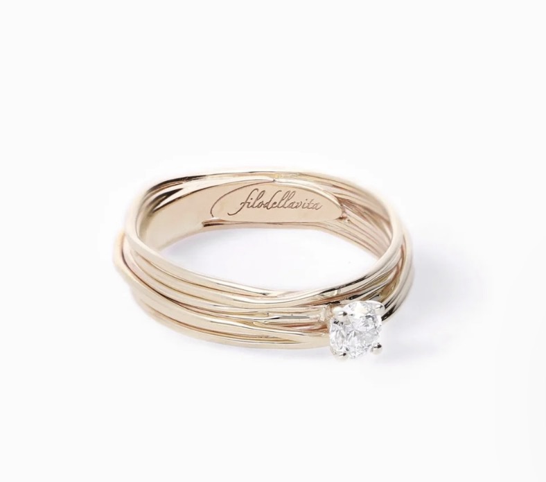 Anello Filodellavita 7 fili in Oro Giallo 9kt con un Diamante Colorless taglio brillante di ct 0.14 corredato da un Certificato Internazionale Indipendente. L’anello perfetto per una proposta speciale, per immortalare un istante unico e prezioso nel tempo.