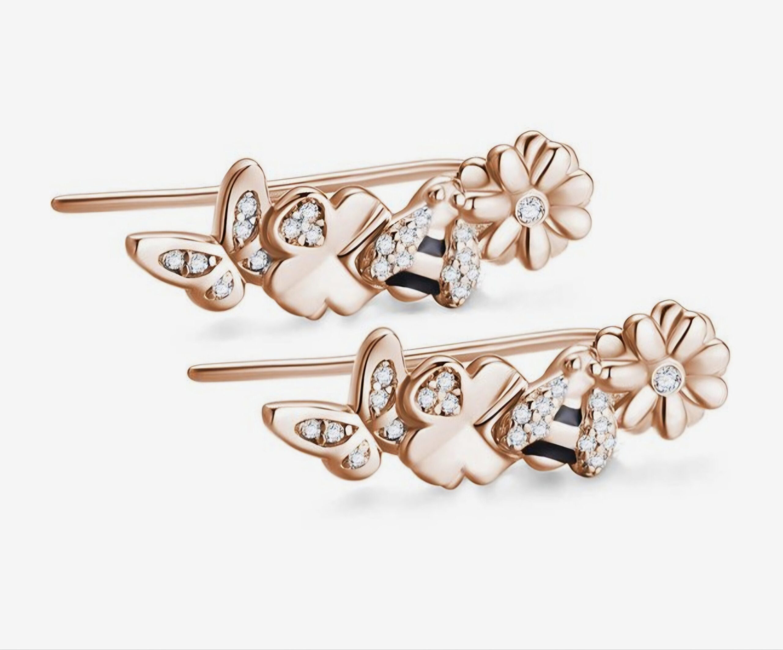 Orecchini donna Rosato Collezione Gaia a lobo in argento 925 placcato oro rosa con farfalla, quadrifoglio, ape, fiore e 40 cubic zirconia bianchi. Chiusura a monachella.