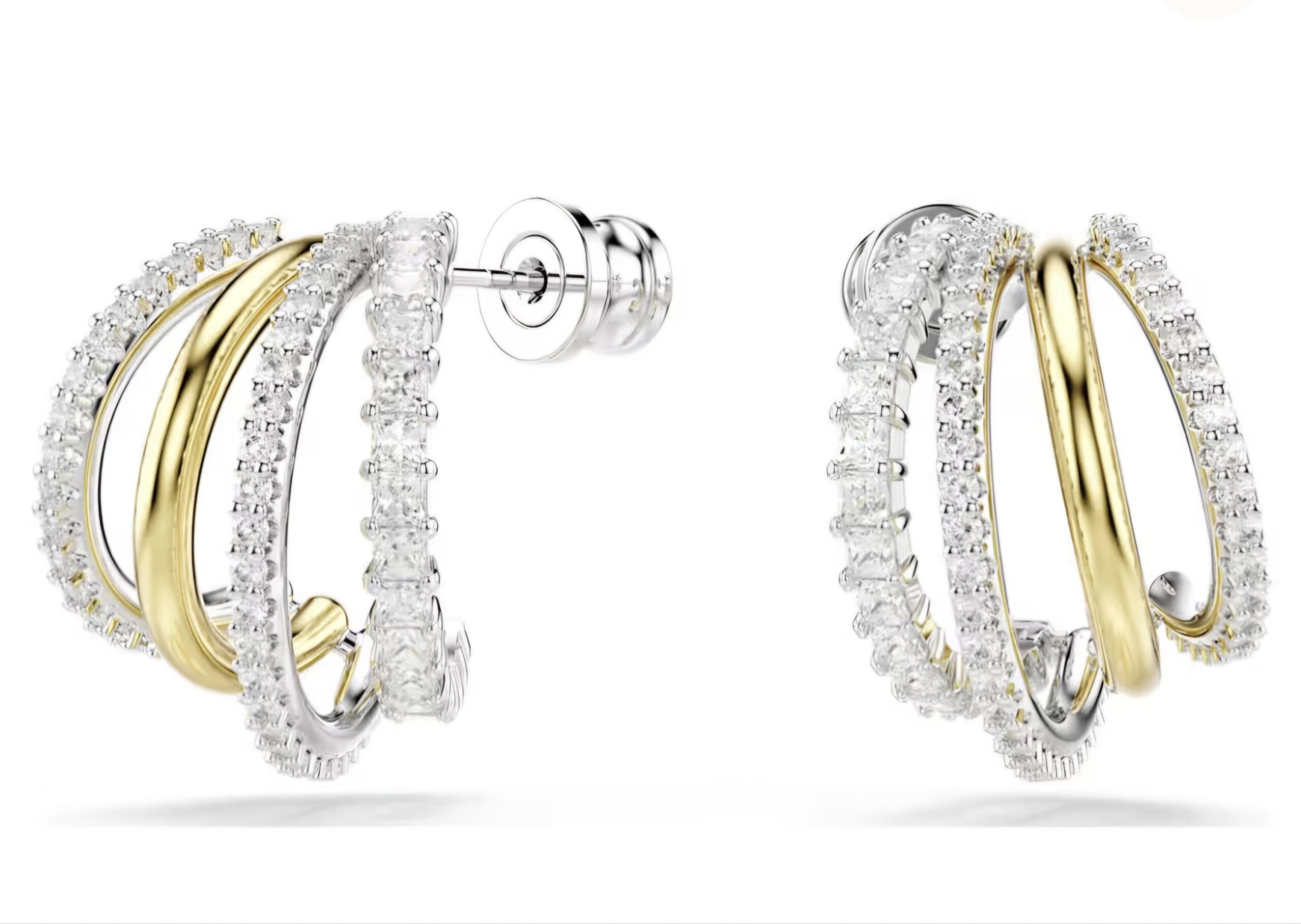 Questi orecchini Hyperbola dagli intricati dettagli trovano bellezza e armonia nei contrasti. Su ciascun lato, i quattro mini cerchi presentano una varietà di finiture del metallo, tra cui le placcature color oro e rodio, e presentano Swarovski Zirconia taglio Round e Square con montatura a griffe.