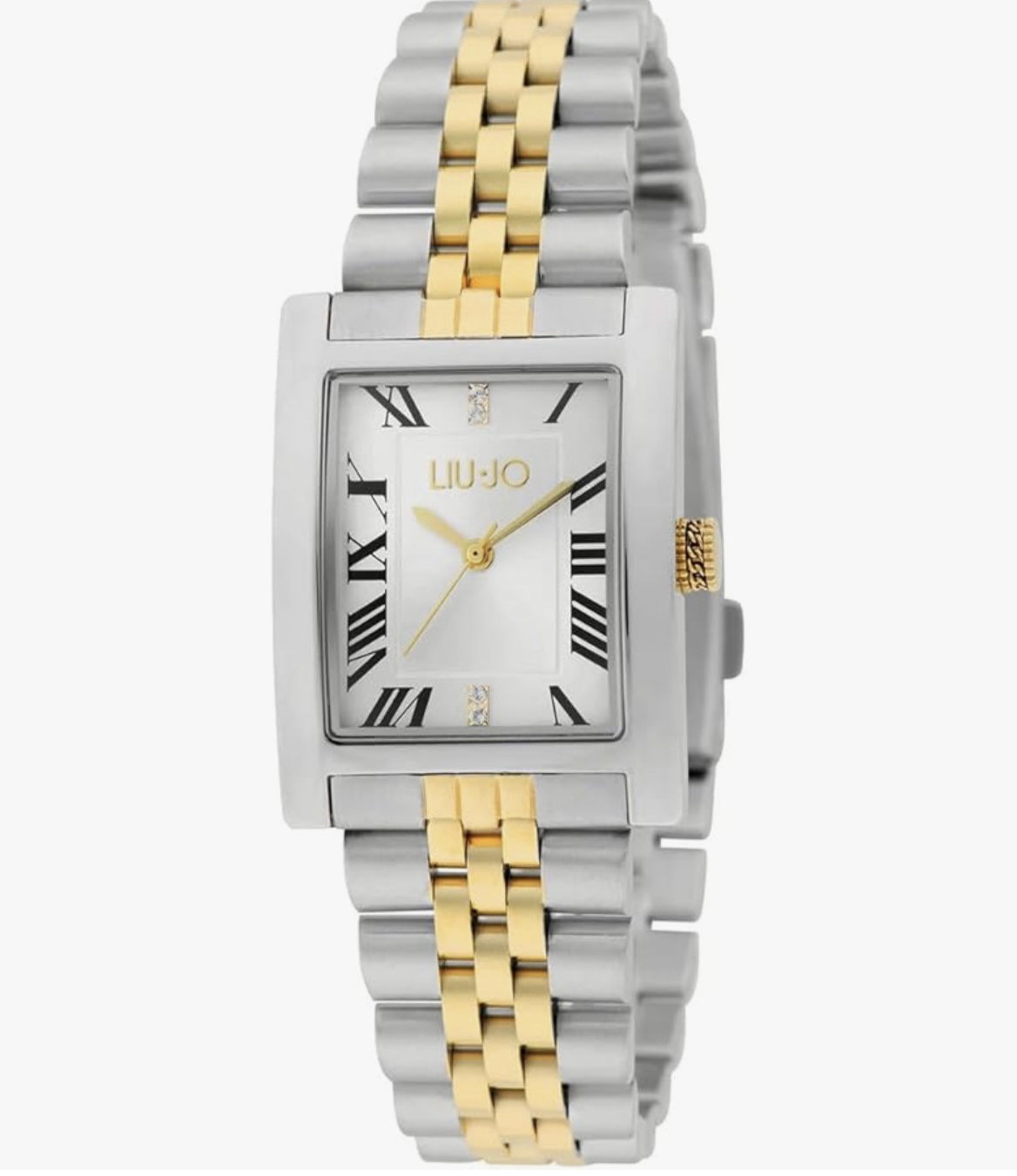 Orologio da Donna con movimento al quarzo, funzione solo tempo. Il diametro della cassa è di 24.5 x 32.5 mm. Spessore 7,7 mm. Quadrante colore silver con Indici romani e indici a barre ore 12 e ore 6 zirconati. Cinturino in acciaio inossidabile con inserti acciaio IP Gold e chiusura deployante.Fondello e corona serrata a pressione. Vetro minerale Impermeabilità fino a 03 ATM.