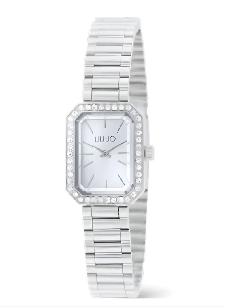 Orologio solo tempo della collezione Liu Jo Brilliant Auriane da donna. Colore della cassa: argento; colore del quadrante: argento; colore del bracciale: argento. Cassa rettangolare di diametro 20 mm in acciaio inossidabile 316L e impreziosita da cristalli. Vetro minerale. Bracciale in acciaio inossidabile 316L con chiusura deployante. Movimento al quarzo. Classificazione di impermeabilitร (WR) 3 bar: resistente agli schizzi dโacqua ed alla pioggia, ma non sotto pressione.