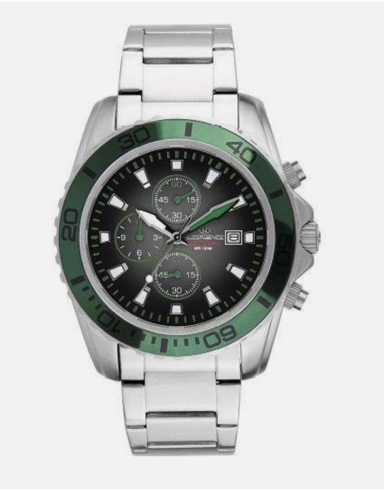 Cronografo con movimento al quarzo Miyota OS10 Japan Made. Cassa in acciaio diametro 46,5 mm. Spessore cassa 12 mm. Fondello in acciaio serrato a vite. Vetro minerale. Ghiera in alluminio verde girevole unidirezionale. Quadrante nero degradรจ. Cinturino in acciaio con chiusura deployante. Datario con giorno del mese a ore 3. Water Resistant 10 Atm.