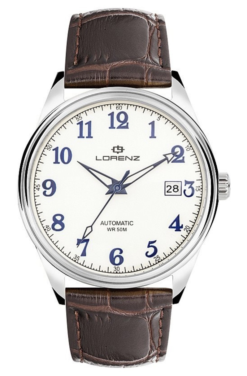 OROLOGIO LORENZ CON MOVIMENTO AUTOMATICO, CASSA IN ACCIAIO CON FONDO A VITE , VETRO MINERALE , DATARIO AL 3 , CINTURINO IN PELLE STAMPATA COCCODRILLO MARRONE, IMPERMEABILE 5 ATM