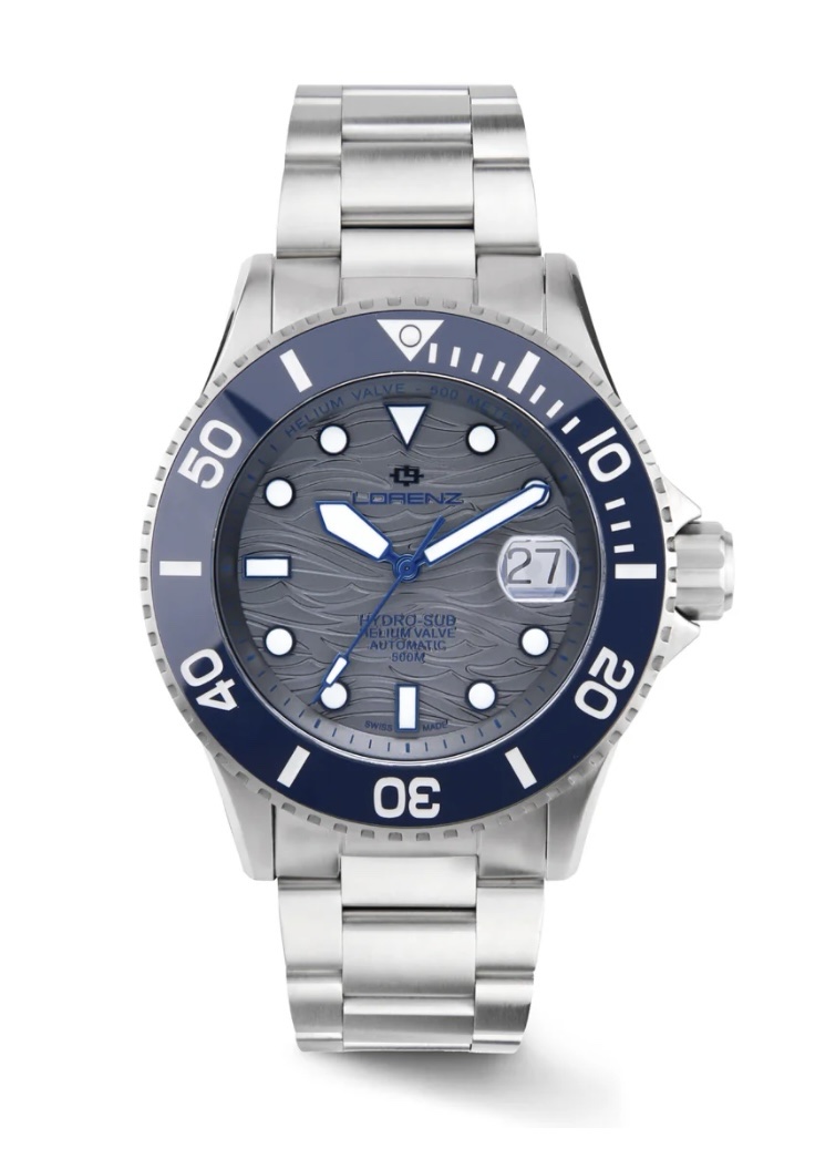 Lorenz Hydro-sub è il nuovo orologio sportivo di alta gamma Swiss Made. Il modello, che si ispira al precedente Hydro-sub, è stato rinnovato con materiali e componenti di altissima qualità. Vetro zaffiro, lunetta in ceramica, valvola per la fuoriuscita dell’elio e allungatura per la muta. Dettagli tecnici lo rendono un orologio professionale. Disponibile in quattro versioni con quadrante degradè e altre due versioni con finitura bicolore. La sua robustezza, la precisione e le funzioni avanzate lo rendono un must have per gli appassionati e intenditori di orologi subacquei. Corredato da uno speciale cofanetto in pelle che contiene un secondo cinturino in gomma con disegno maglia milanese, lente e cacciavite.