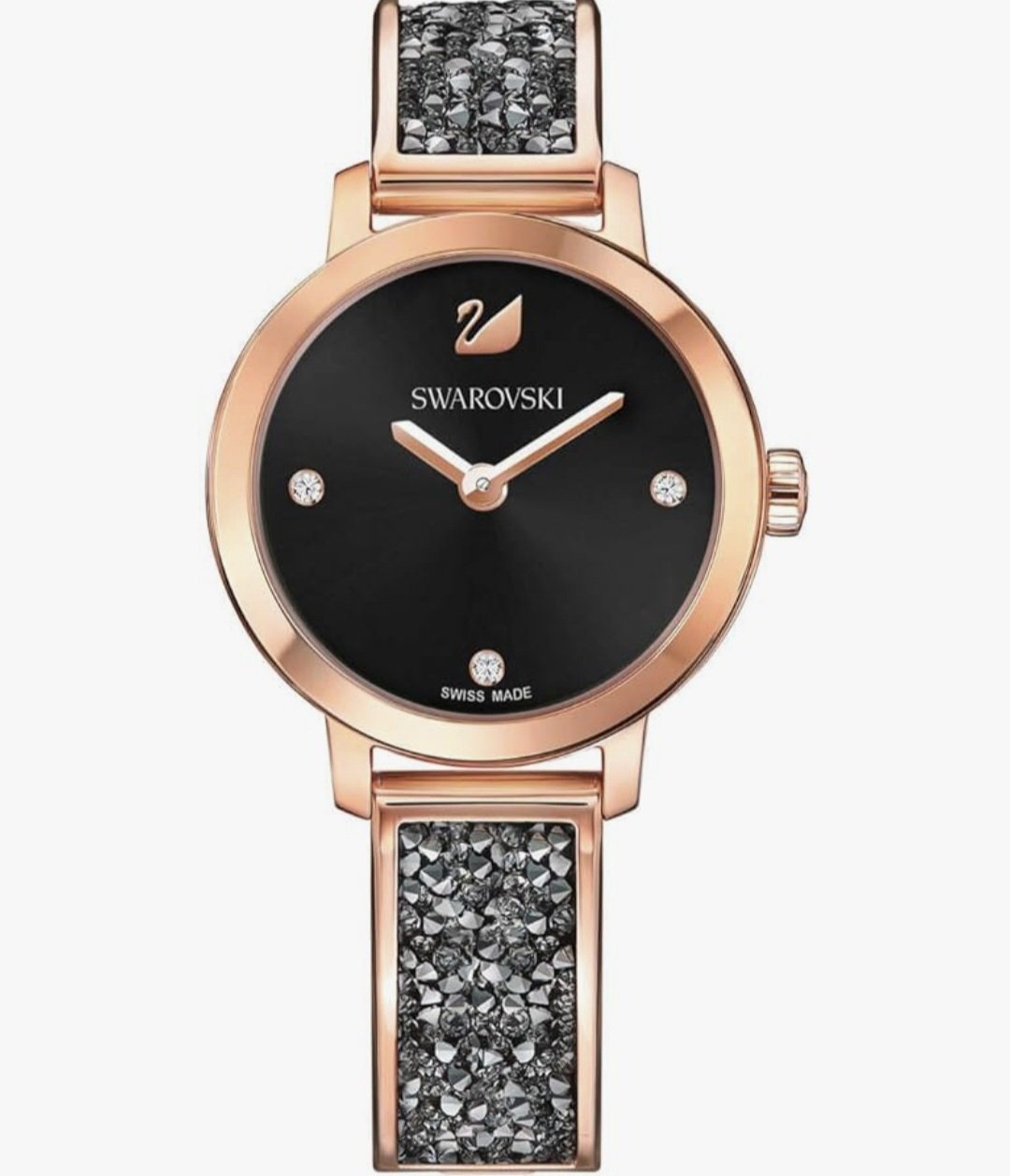 Orologio Solo Tempo Di Swarovski Da Donna Della Collezione Cosmic Rock. Orologio Cosmic Rock, Bracciale Di Metallo, Di Colore Nero, Tono Oro Rosa. Orologio Caratterizzato Da Quadrante Con Motivo Radiale Grigio Scuro, Completato Da Cassa E Bangle In Acciaio Inossidabile Rivestiti Nella Tonalitร Oro Rosa. Orologio Swiss Made Con Resistenza All’Acqua Di 5 Atm. Misura Cassa: 29 Mm, Lunghezza Cinturino: 18
