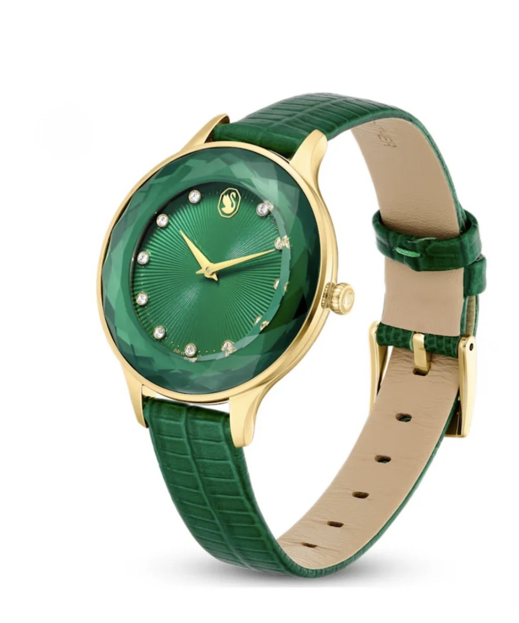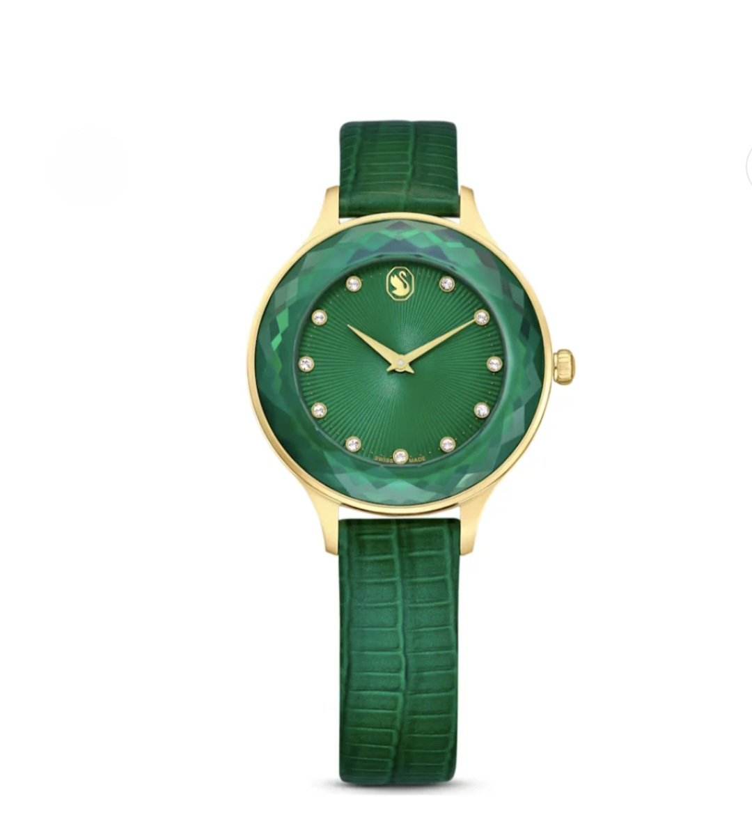 L’ Orologio Octea Nova Fabbricato in Svizzera Cinturino in pelle Verde Finitura dorata.Questo straordinario orologio dal diametro di 33 mm diffonde un vivace tocco di colore ogni volta che lo indossi. Il segnatempo Swiss Made in acciaio inossidabile con finitura color oro si distingue soprattutto per la lunetta e il quadrante, realizzati a partire da un singolo cristallo sapphire con 72 sfaccettature. Per aggiungere un ulteriore tocco di stile, il quadrante guilloche verde presenta indicatori delle ore fatti di cristalli e un elegante motivo a cigno posizionato all’altezza delle ore 12. Questo orologio verde e impermeabile fino a 50 m ed e dotato di un cinturino in pelle di vitello italiana con motivo a lucertola in rilievo. Sceglilo per ravvivare il tuo stile quotidiano.